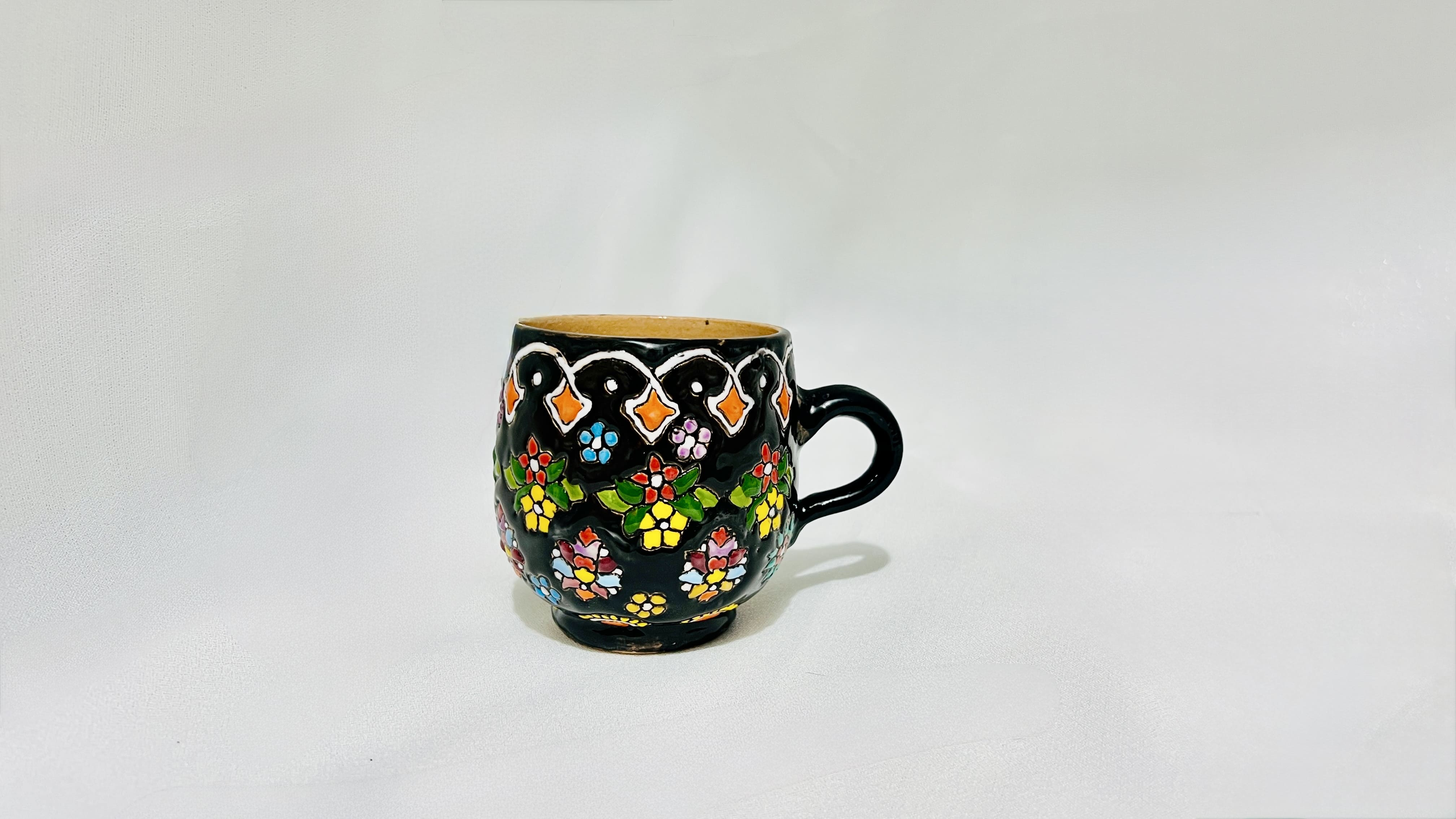 This handcrafted Afghan goblet is made from clay and adorned with colorful mina-style painting. A unique item perfect for traditional table settings or as a decorative cultural piece.