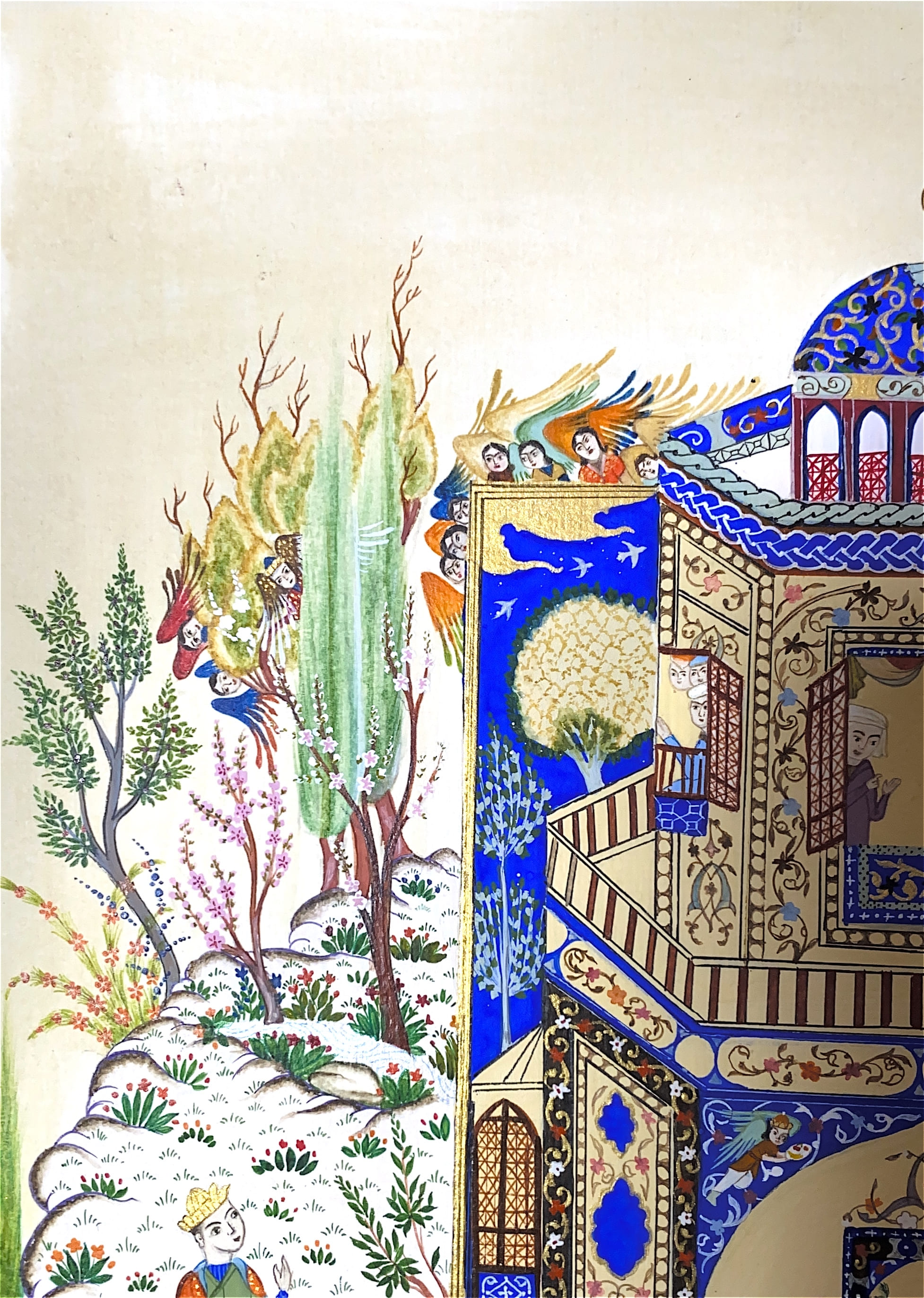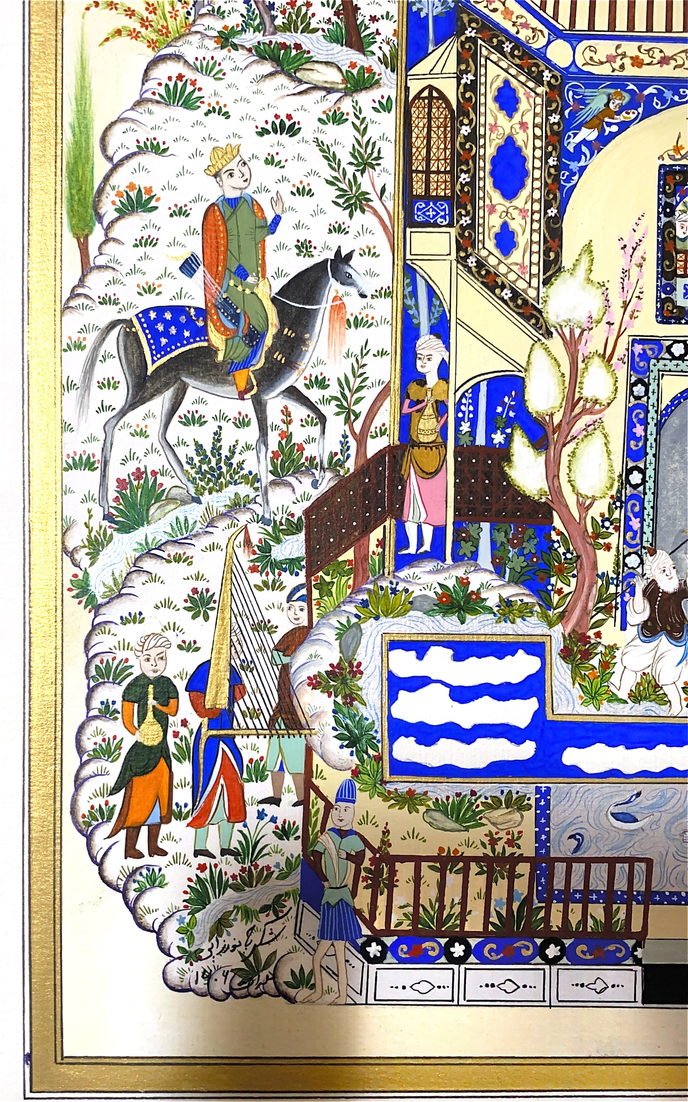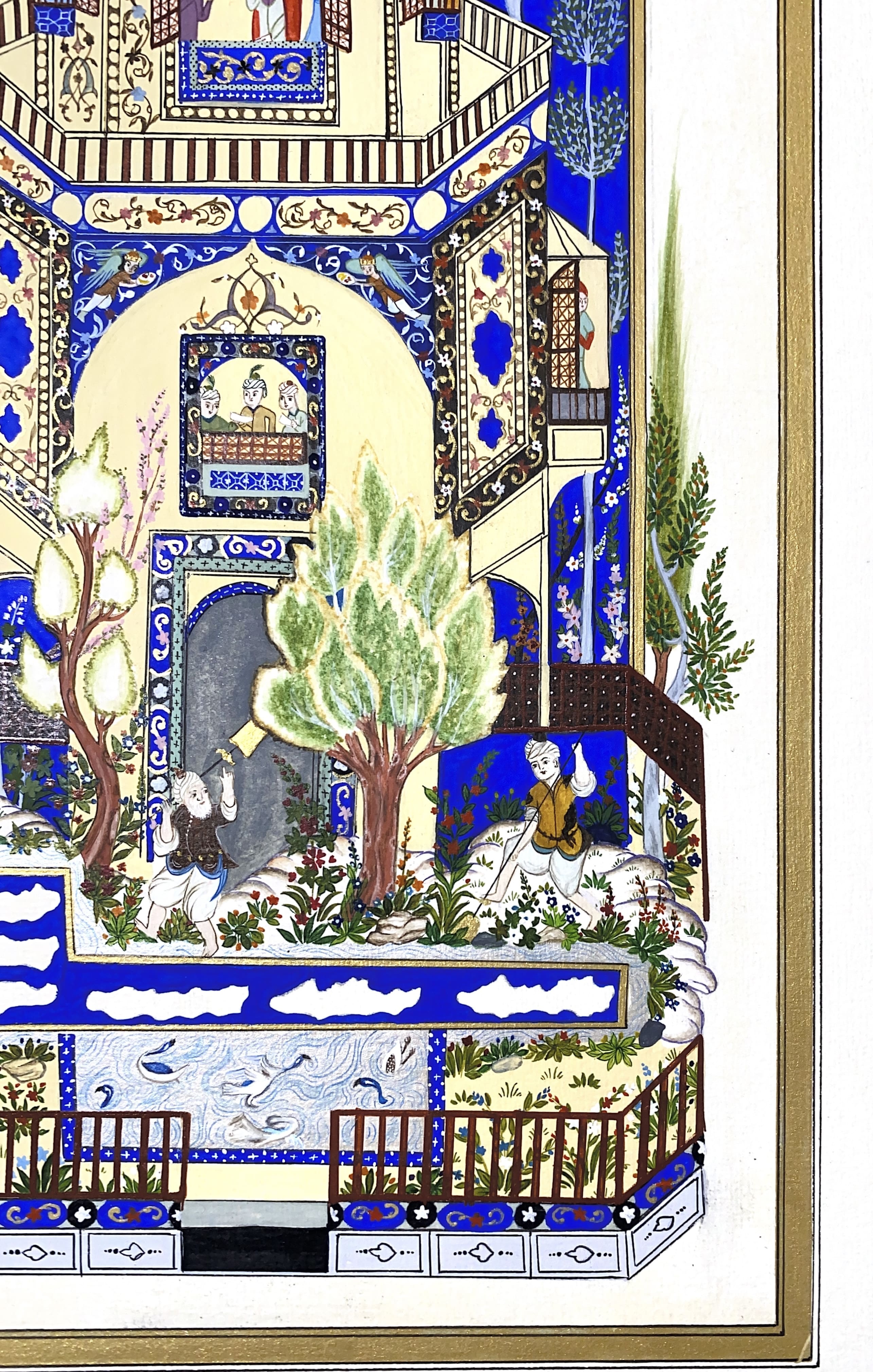 This miniature shows Khosrow in Shirin’s palace, a masterpiece of love tales. The vivid blues and golds reflect the beauty, longing, and royal elegance that define Nizami’s timeless romance.