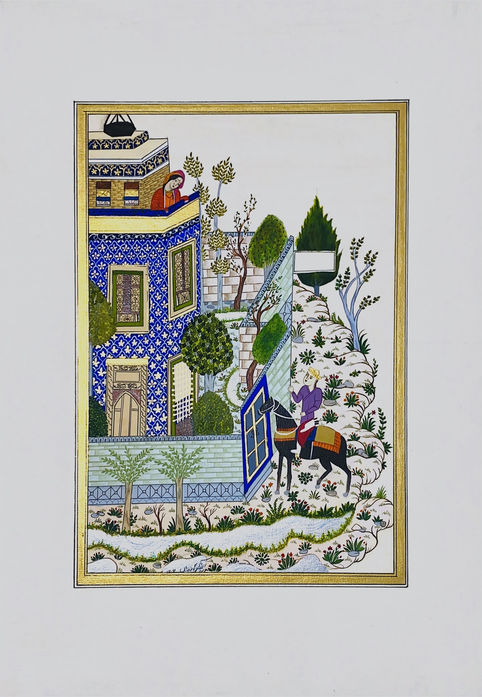 This miniature shows the first meeting of Khosrow and Shirin, a timeless symbol of love. The vivid blue palace and gentle garden reflect passion, purity, and destiny intertwined in art.