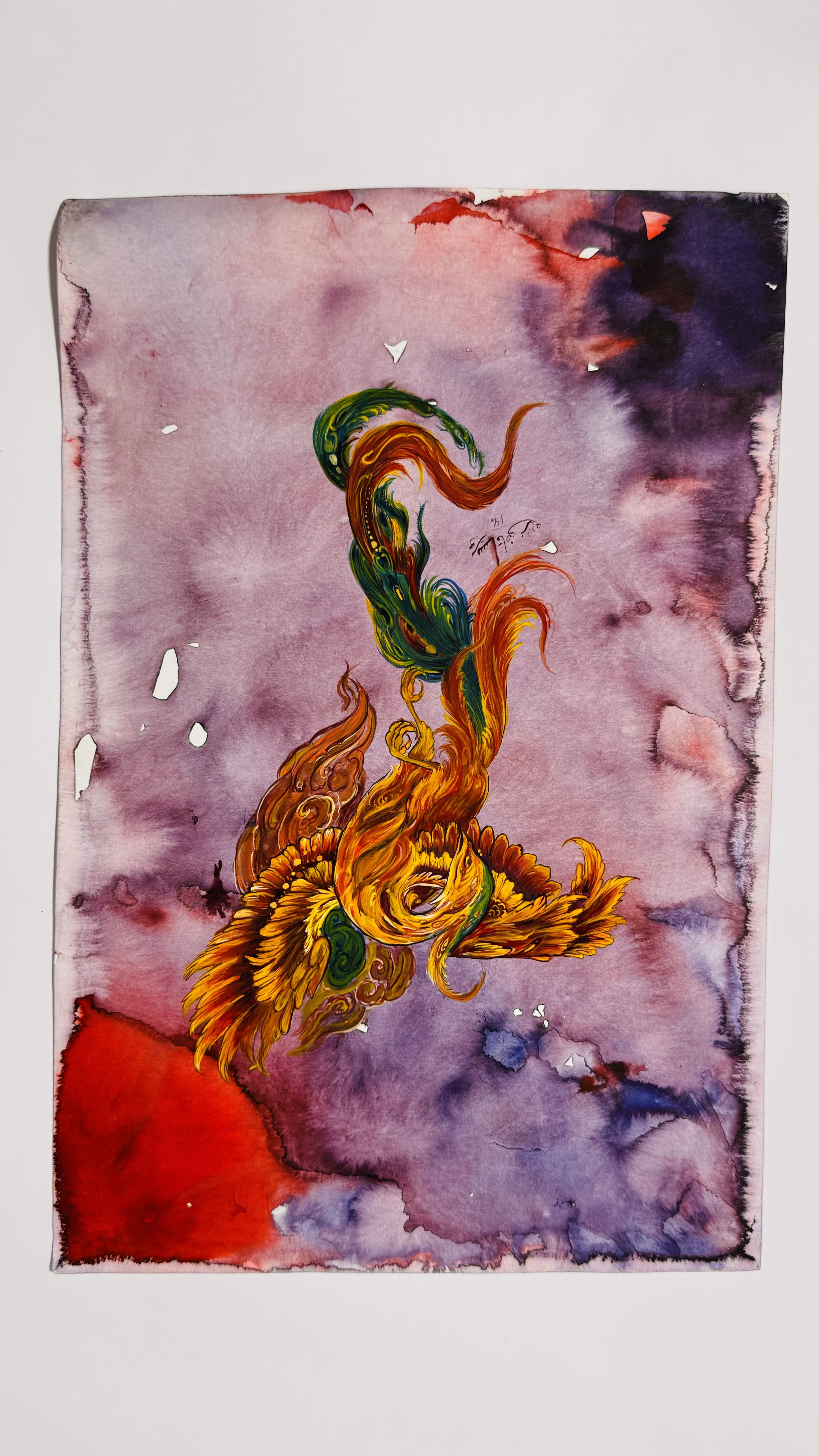 From the heart of fire and bloom, a mystical form rises—half flame, half feather. This painting whispers of rebirth, transformation, and the eternal dance of soul and nature in unity.
