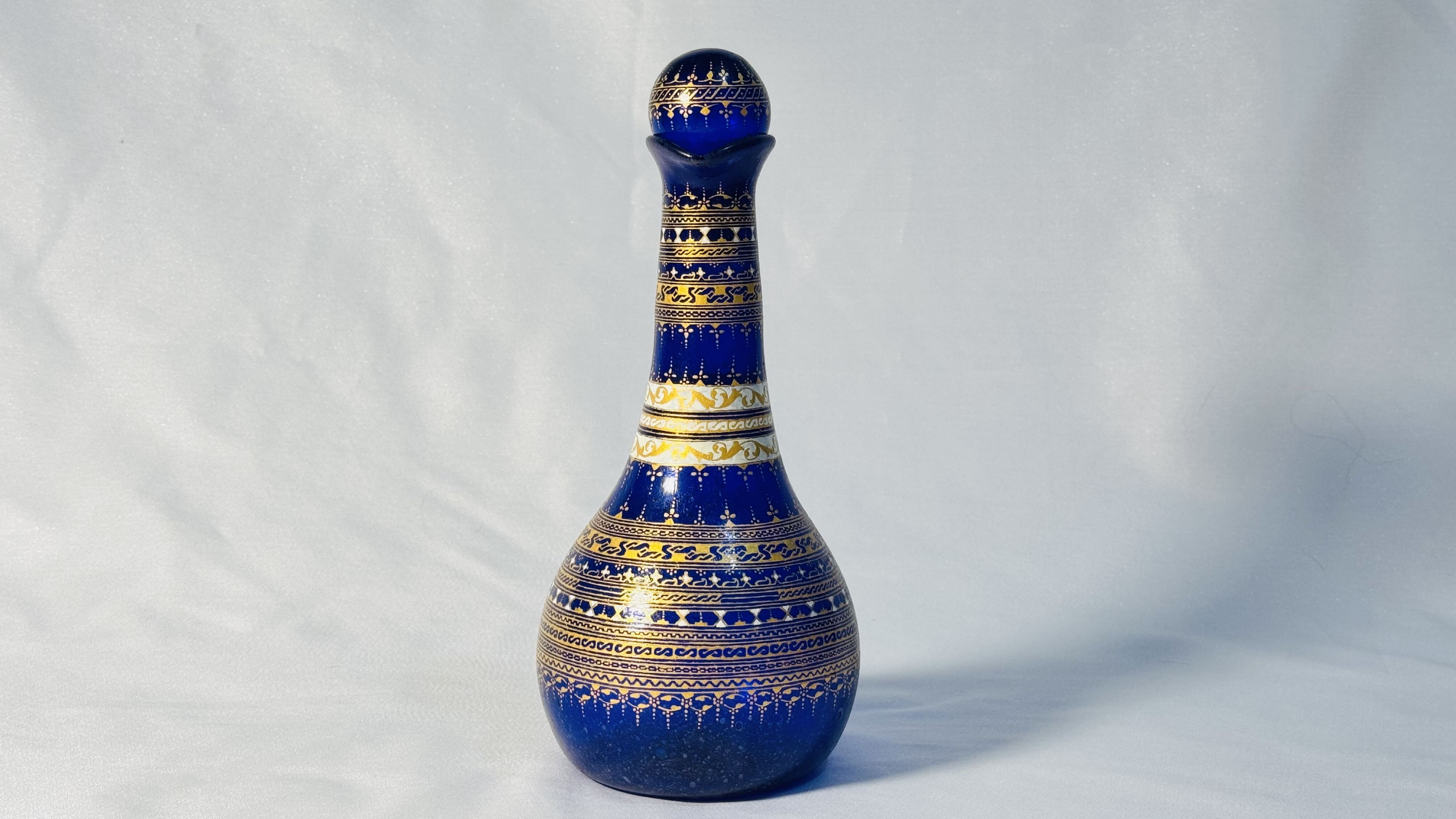 This handcrafted Azah glassware set from Herat, Afghanistan features a royal cobalt blue finish with elegant gold, silver, and turquoise patterns. A timeless piece of Afghan artistry and tradition.
