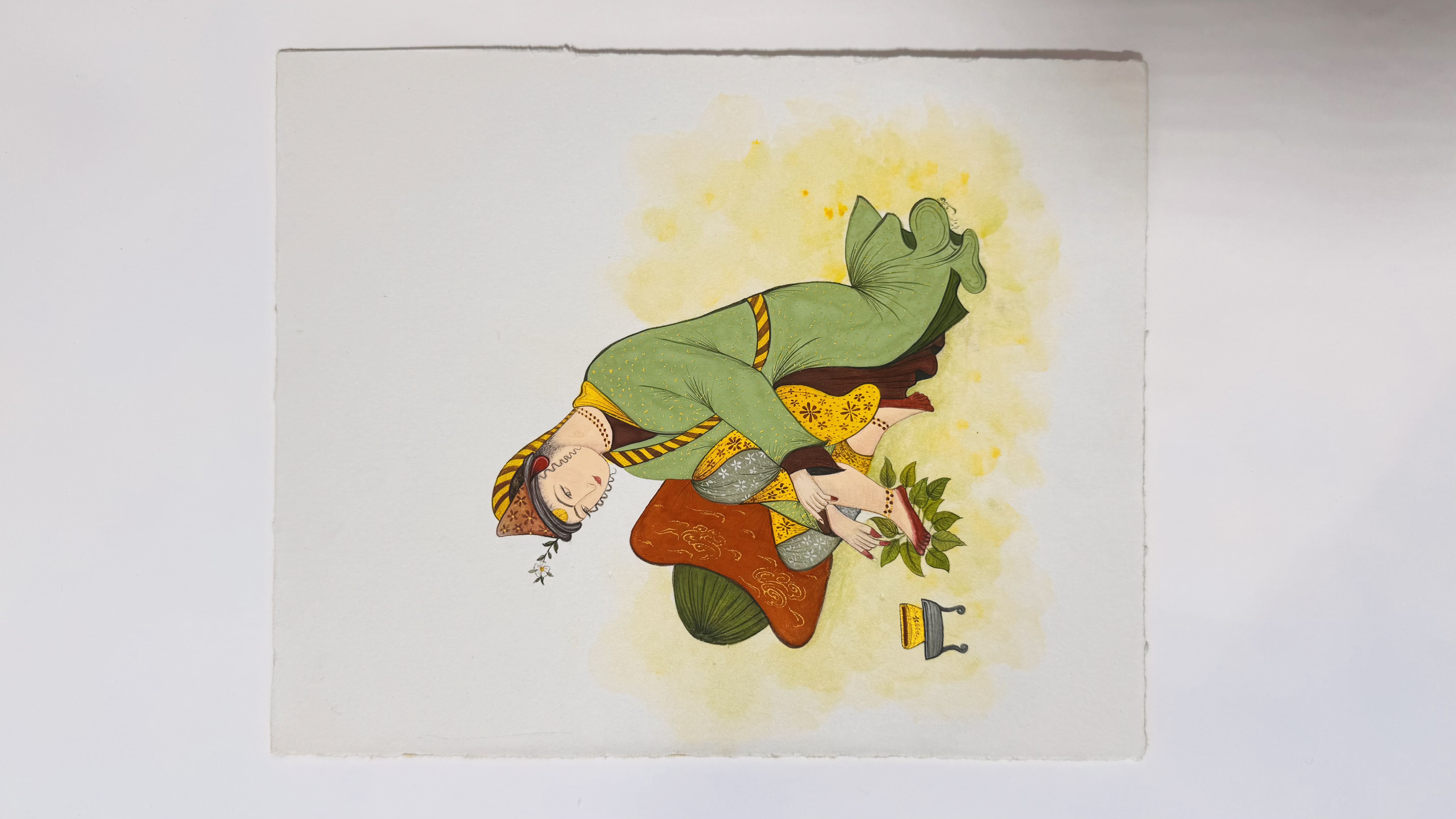 A delicate miniature of a woman applying henna on her hands and feet, symbolizing beauty, tradition, and celebration. Her calm posture reflects the grace of Eastern rituals.