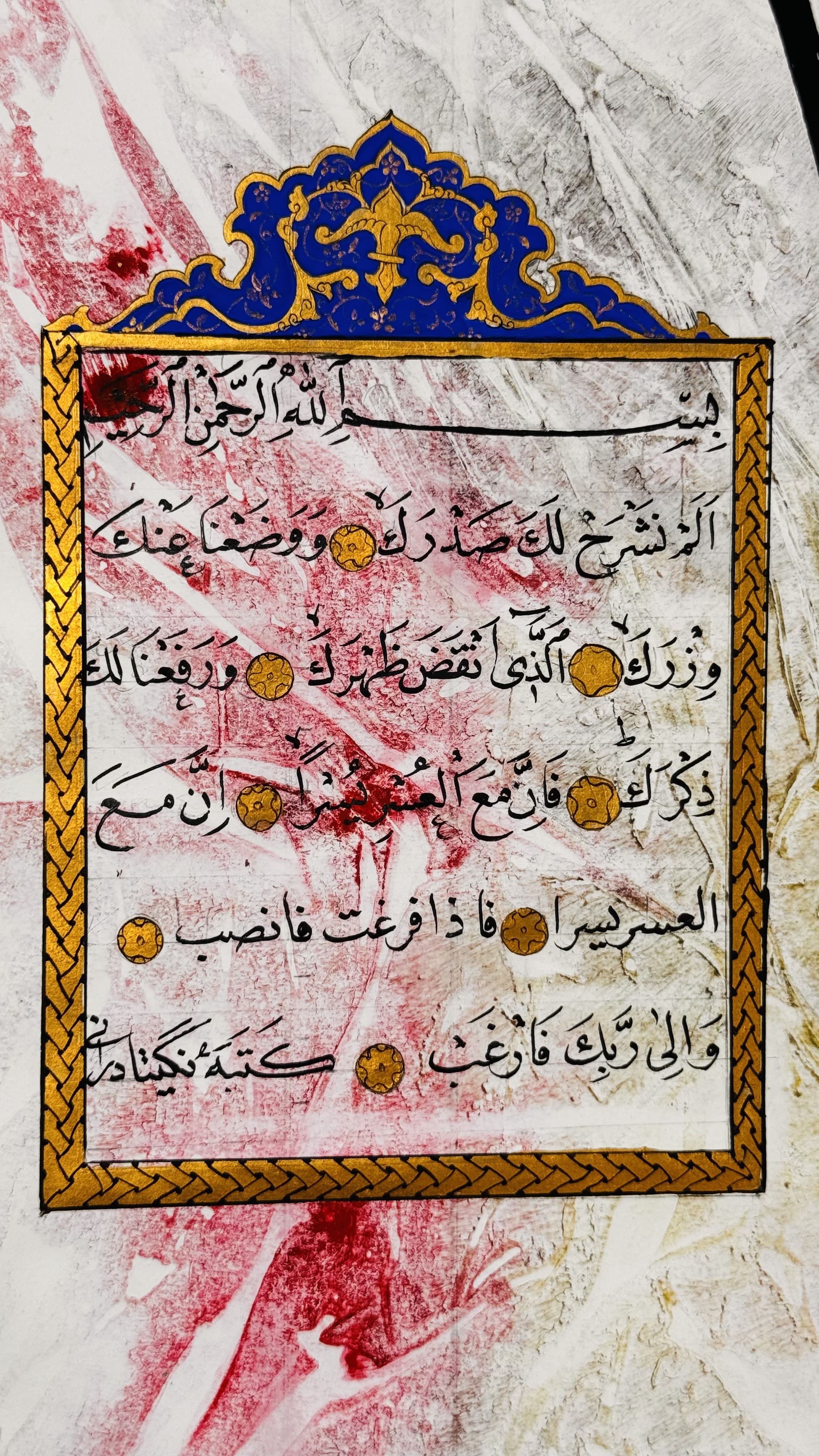 This calligraphy presents Surah Al-Inshirah, a chapter that speaks of ease after hardship. Each line is gracefully written to reflect divine reassurance, hope, and the beauty of spiritual relief.