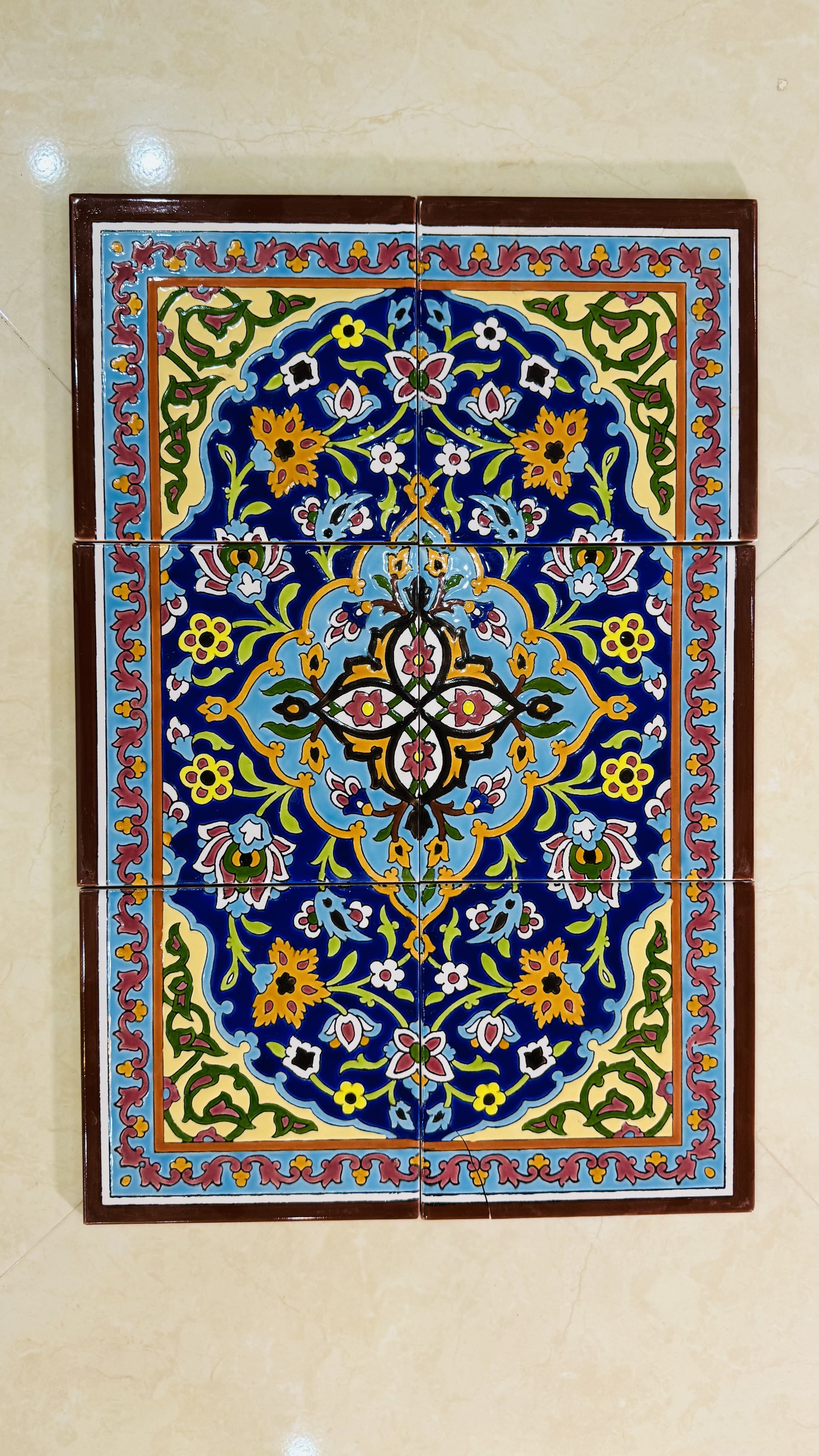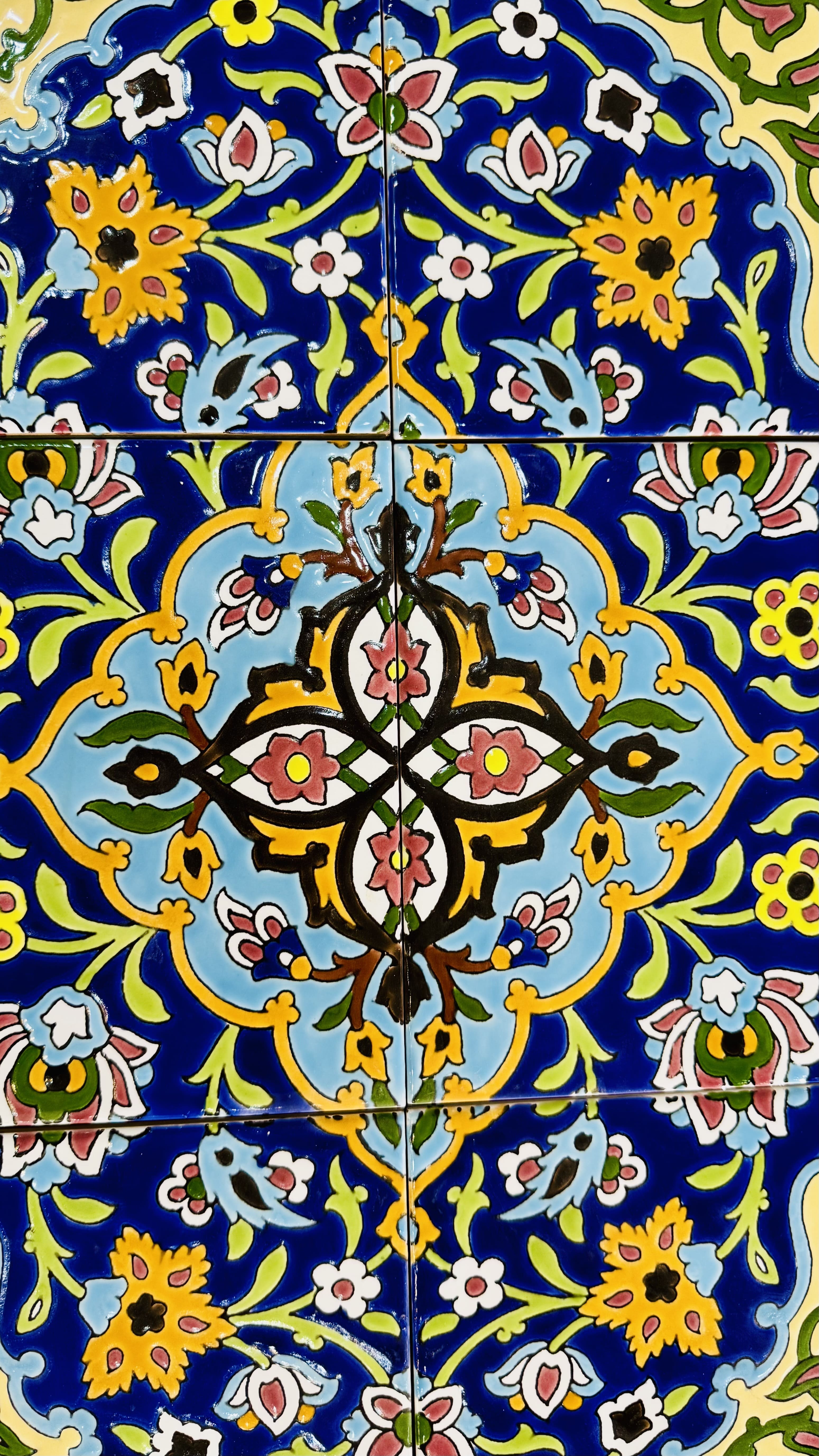 This handmade Islamic tile design features intricate floral and arabesque patterns in vibrant turquoise and navy, celebrating centuries of traditional craftsmanship and artistic heritage.