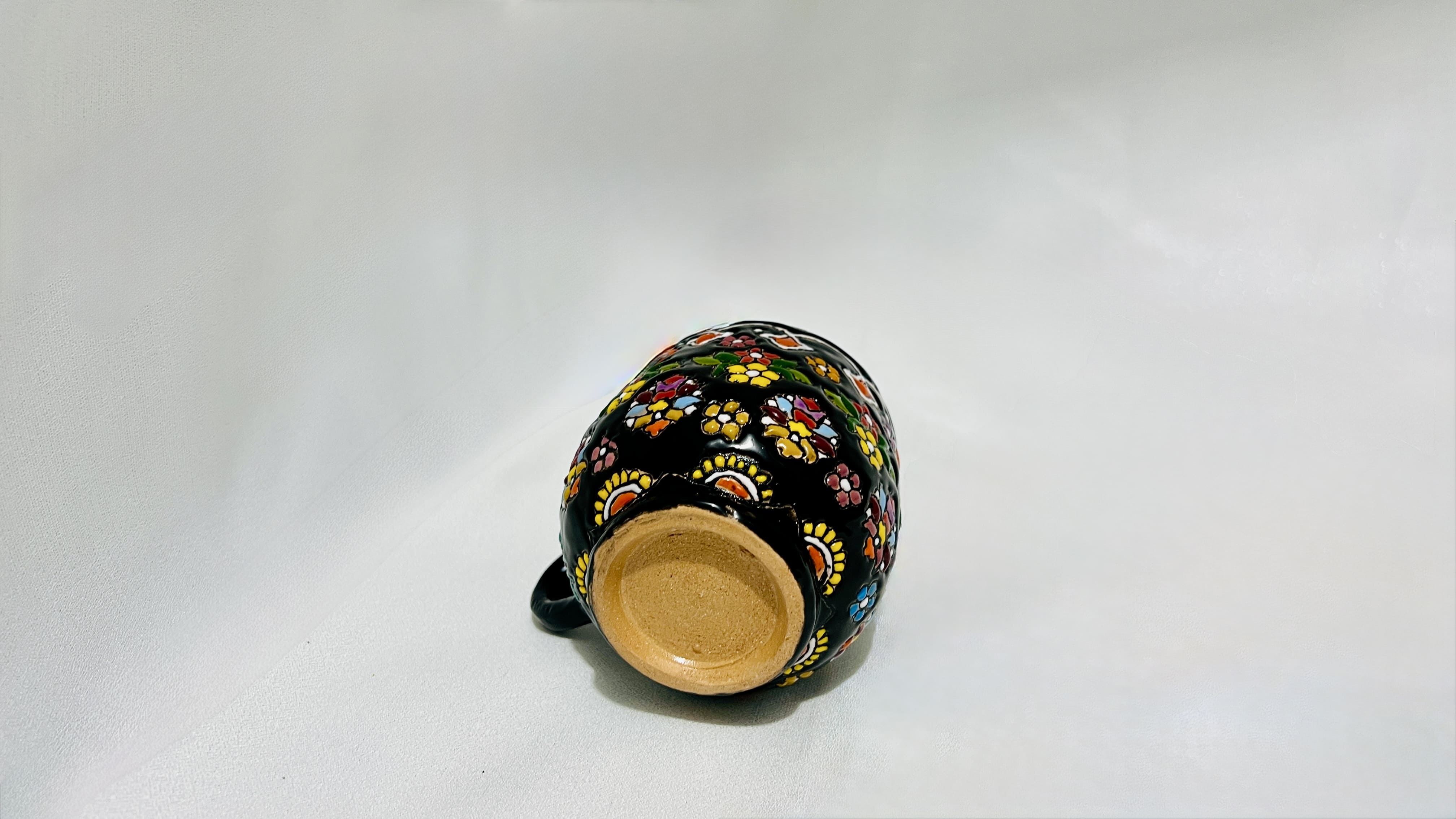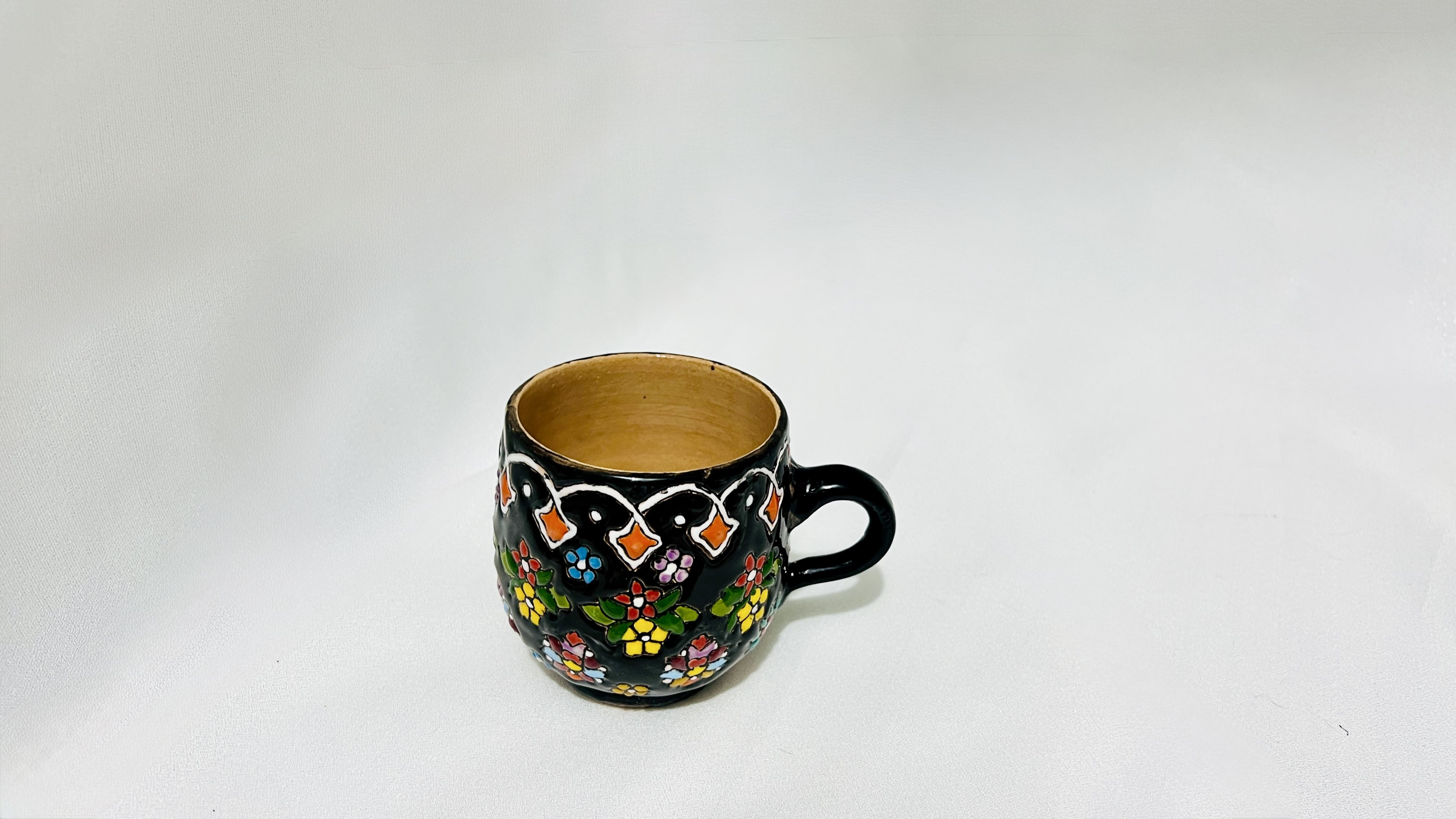 This handcrafted Afghan goblet is made from clay and adorned with colorful mina-style painting. A unique item perfect for traditional table settings or as a decorative cultural piece.