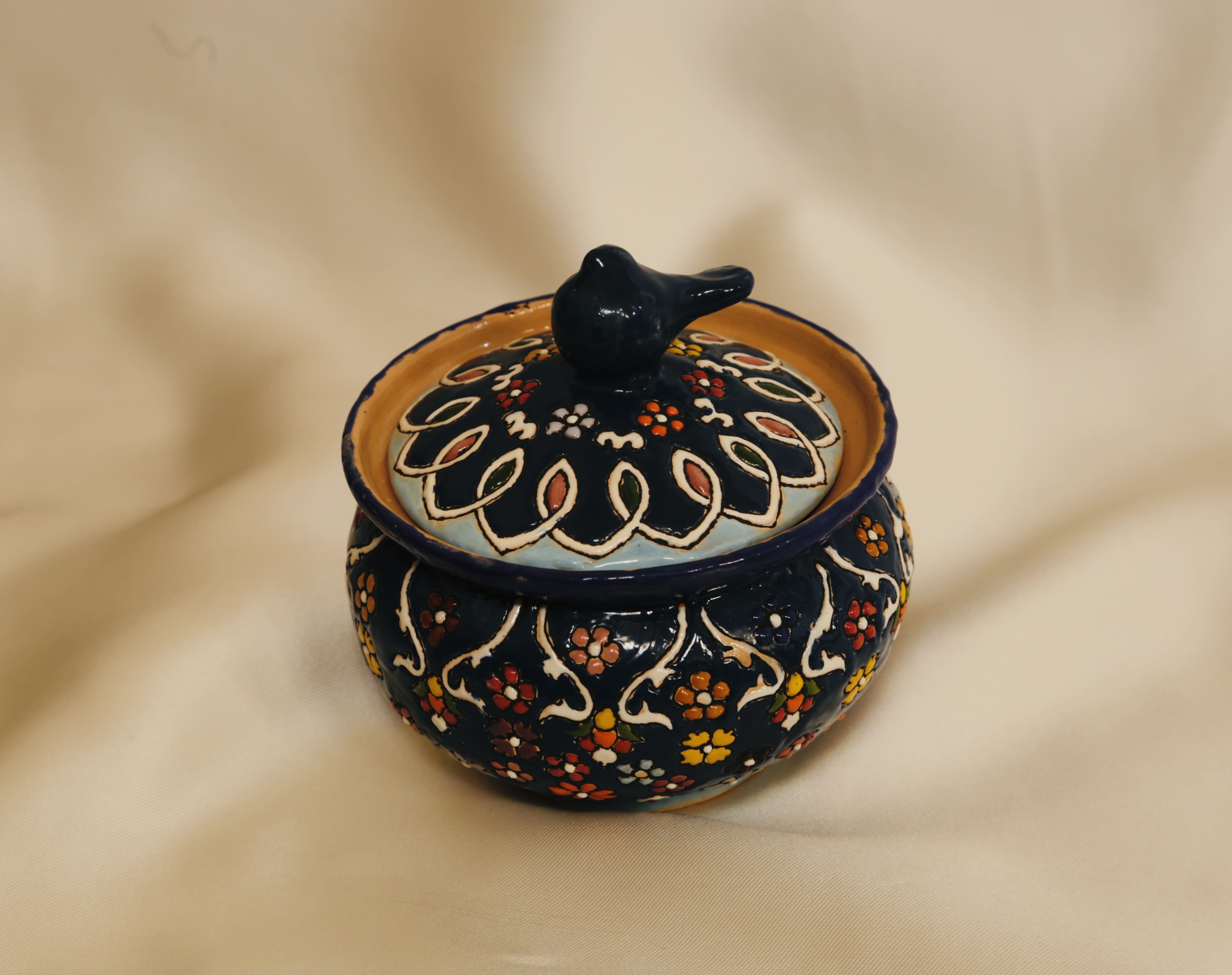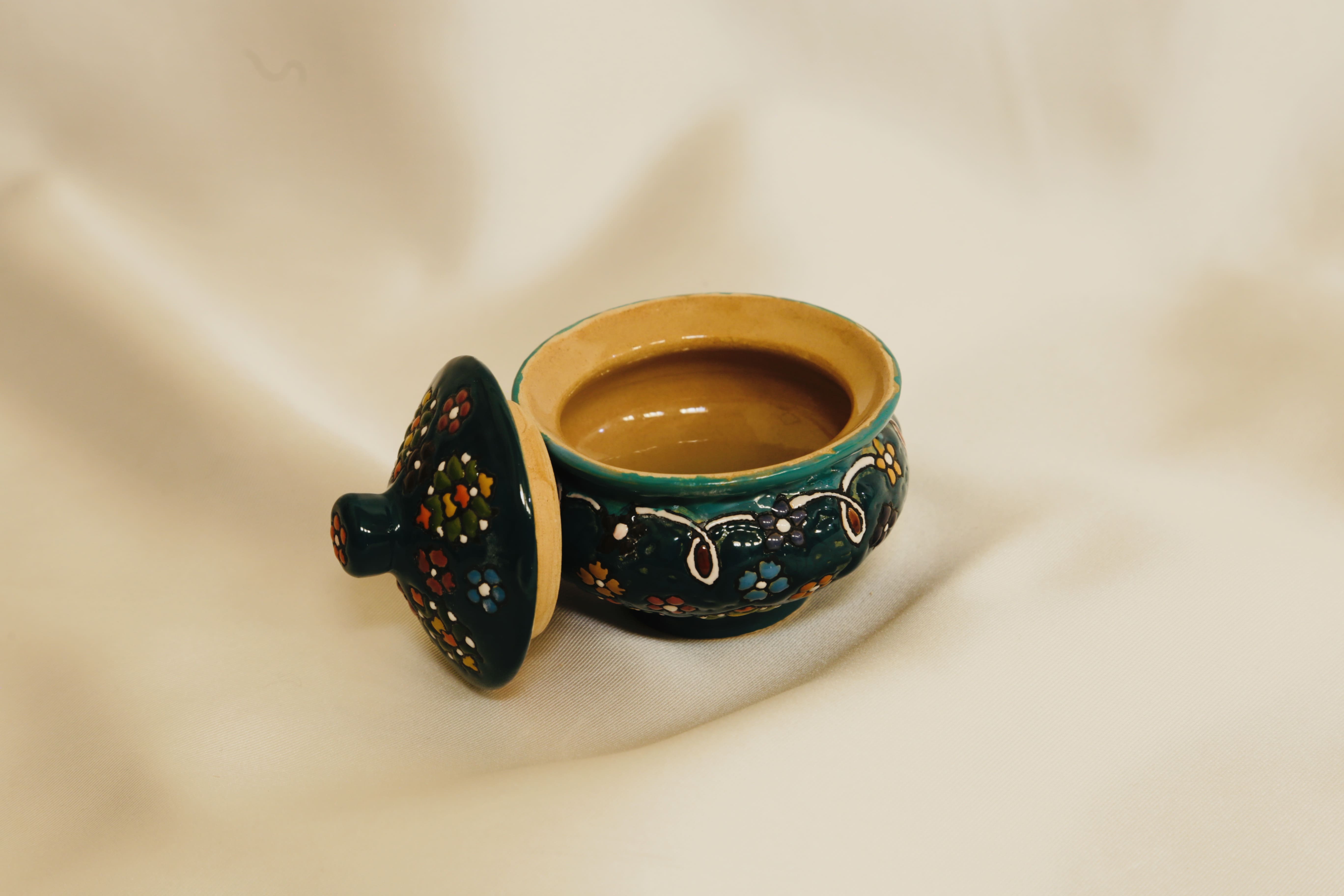 This handmade Afghan sugar bowl is crafted from clay and adorned with vibrant mina-style patterns. A charming piece that adds tradition, color, and warmth to every tea gathering.