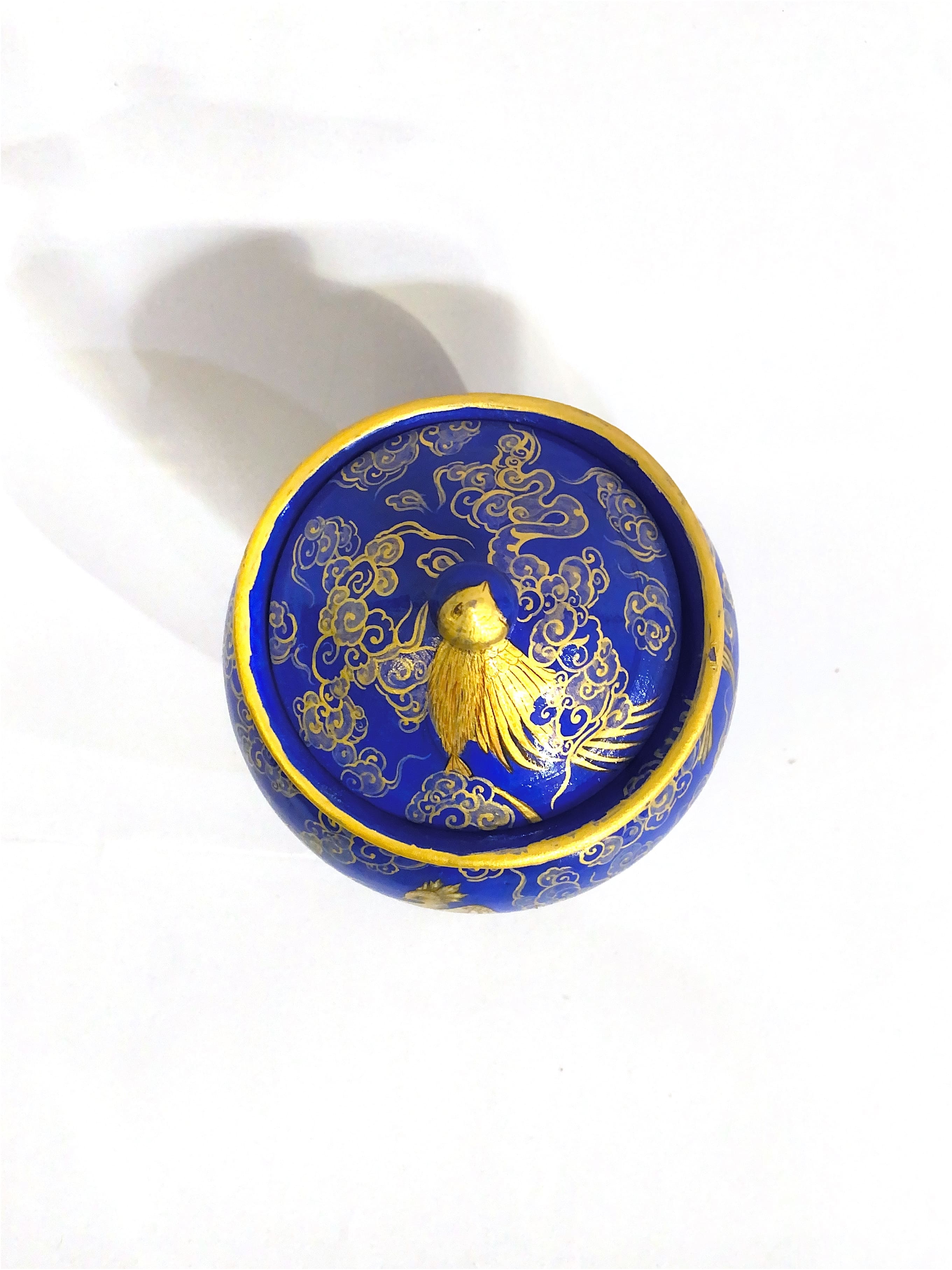 This handcrafted blue pottery jar, adorned with golden phoenix motifs, blends Afghan elegance with mythical symbolism. The vivid cobalt glaze and fine miniature art evoke beauty and immortality.