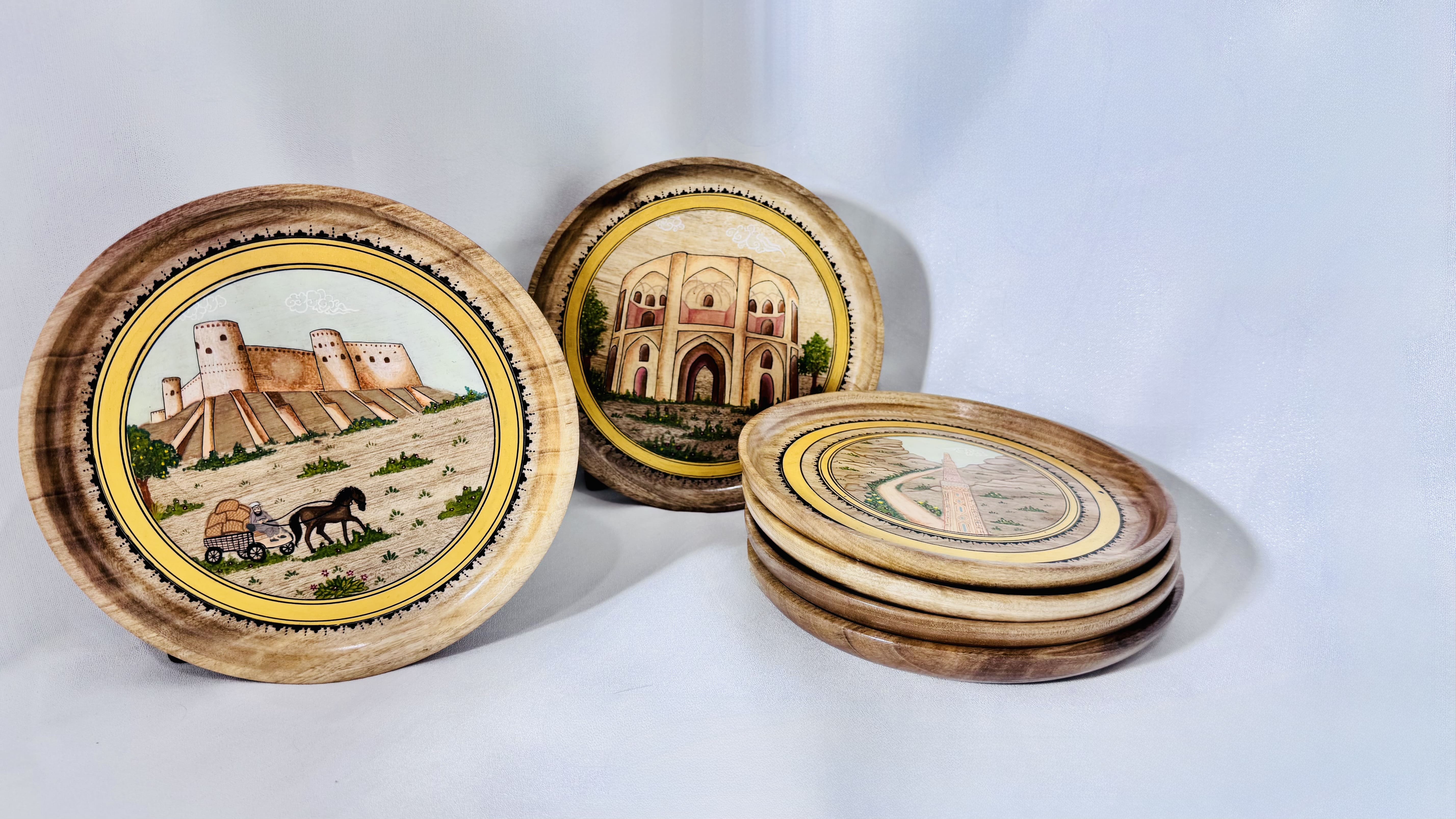 Handcrafted wooden plates featuring miniature paintings of Afghan heritage sites. Each piece is a timeless tribute to culture, history, and traditional craftsmanship.