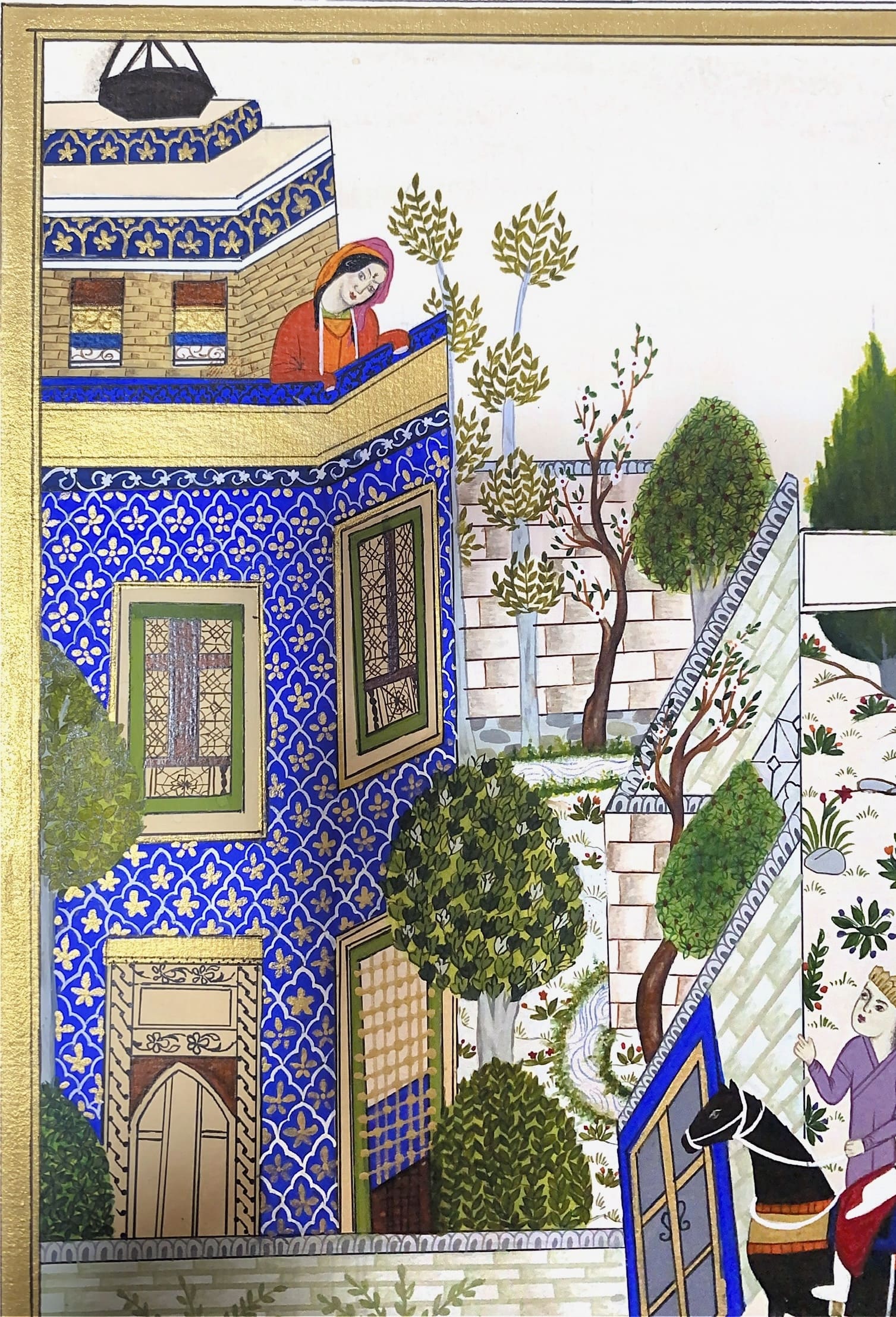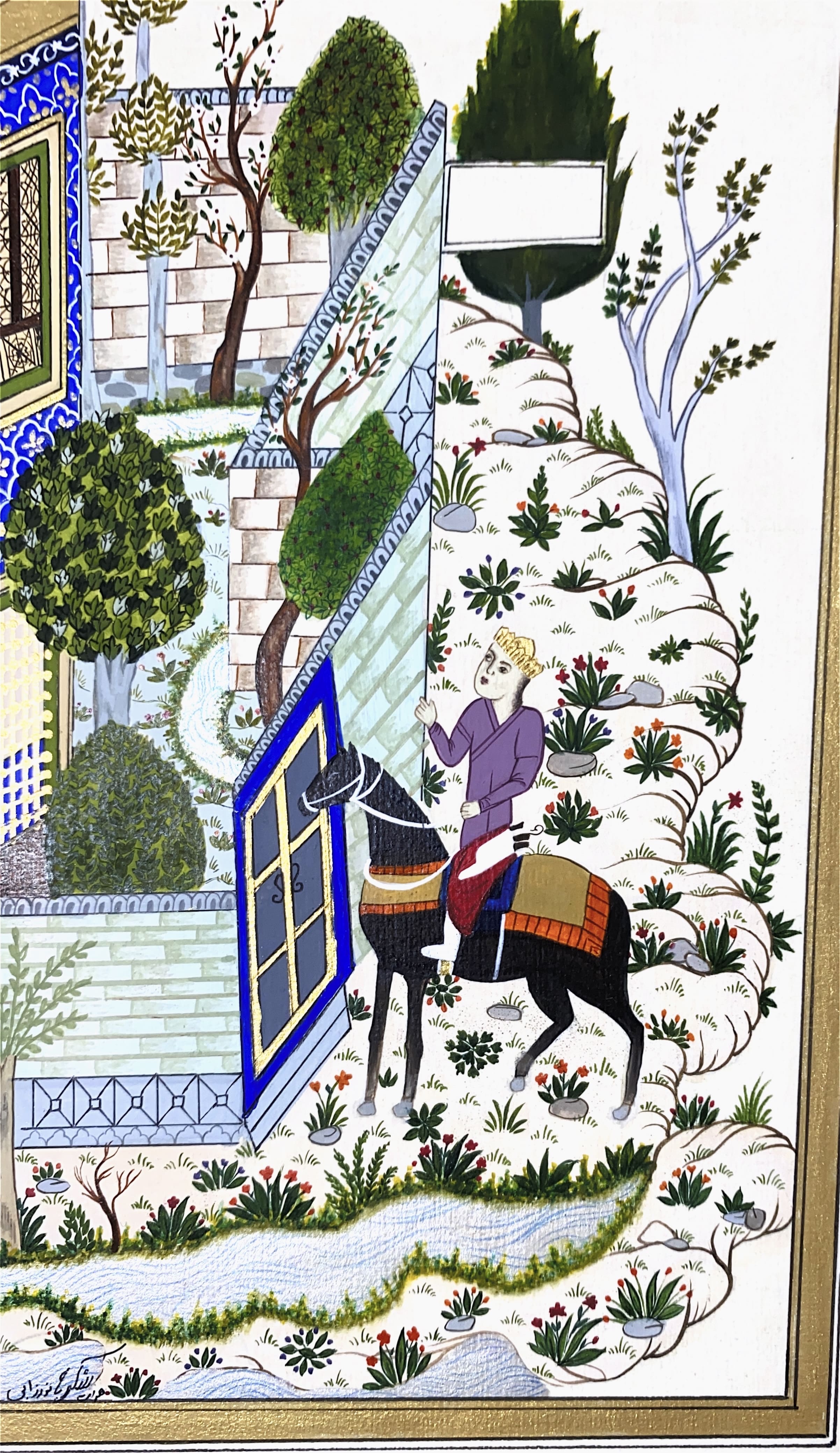 This miniature shows the first meeting of Khosrow and Shirin, a timeless symbol of love. The vivid blue palace and gentle garden reflect passion, purity, and destiny intertwined in art.