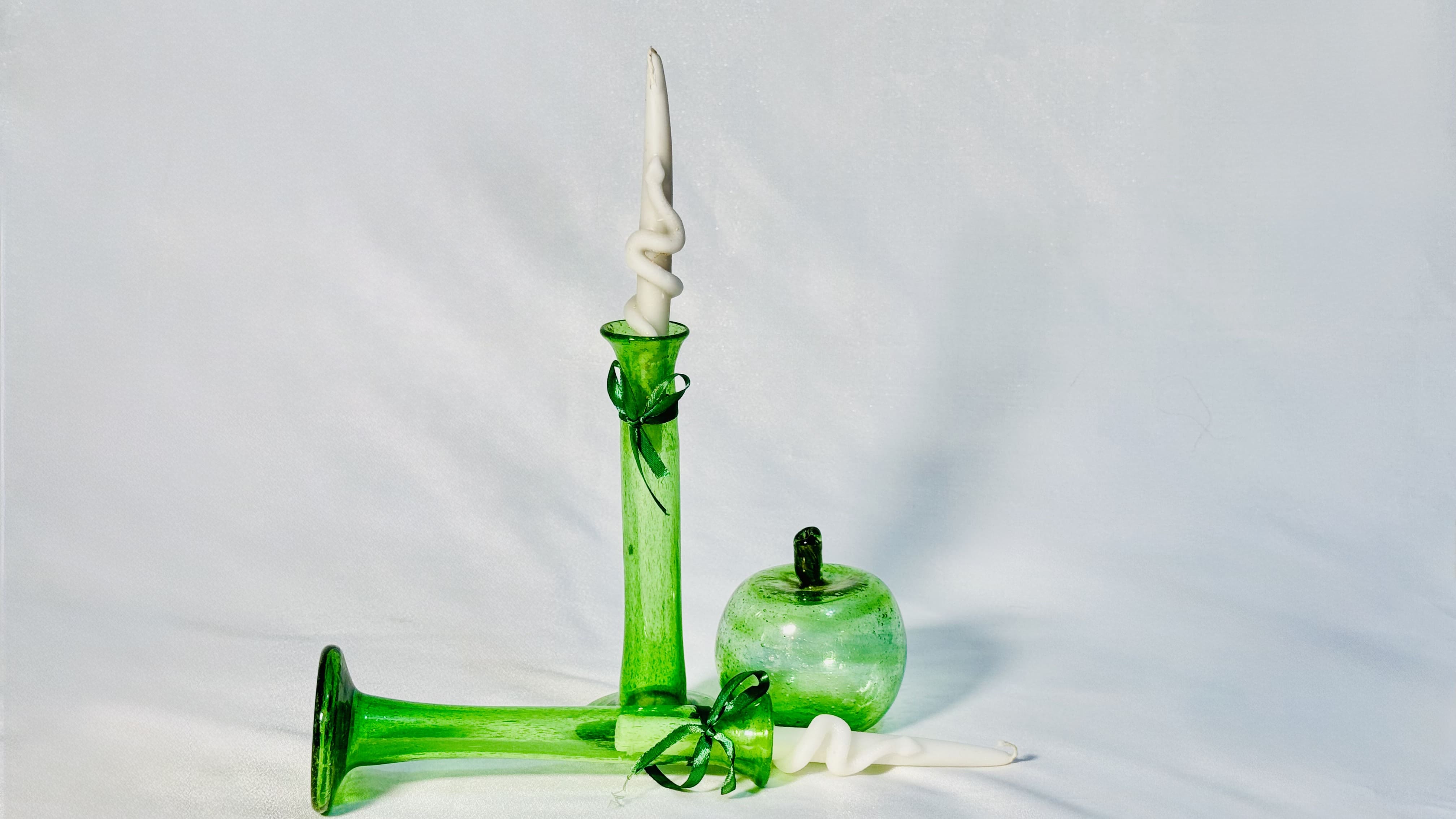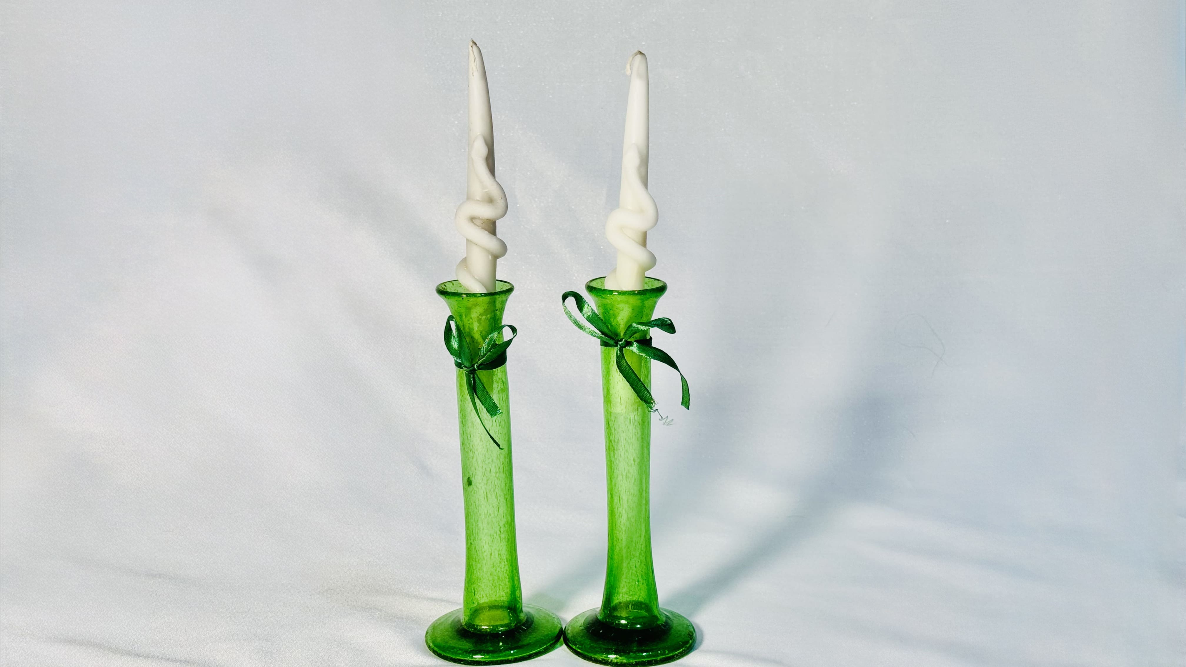 These elegant green glass candlesticks are handmade in Herat, Afghanistan. Their minimalist design with delicate ribbon details makes them perfect for home décor, special dinners, or gifts.