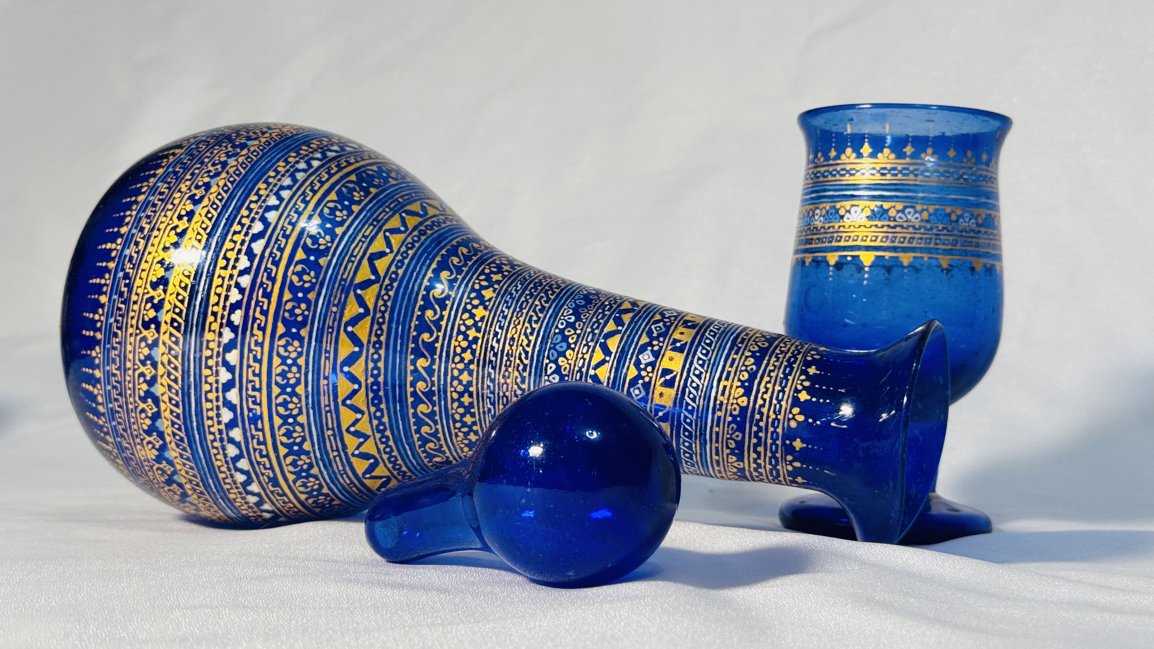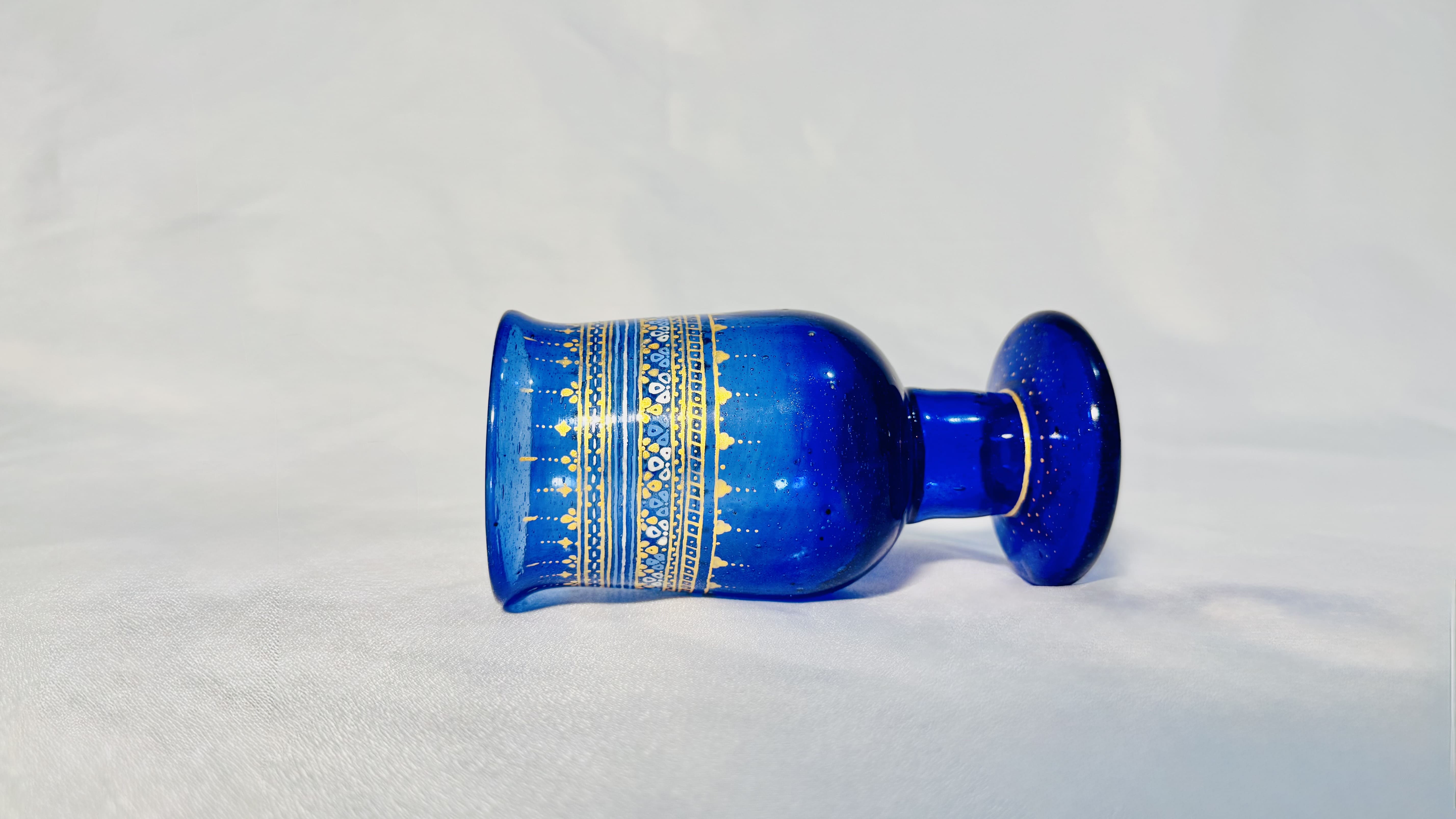 This handcrafted Azah glassware set from Herat, Afghanistan features a royal cobalt blue finish with elegant gold, silver, and turquoise patterns. A timeless piece of Afghan artistry and tradition.