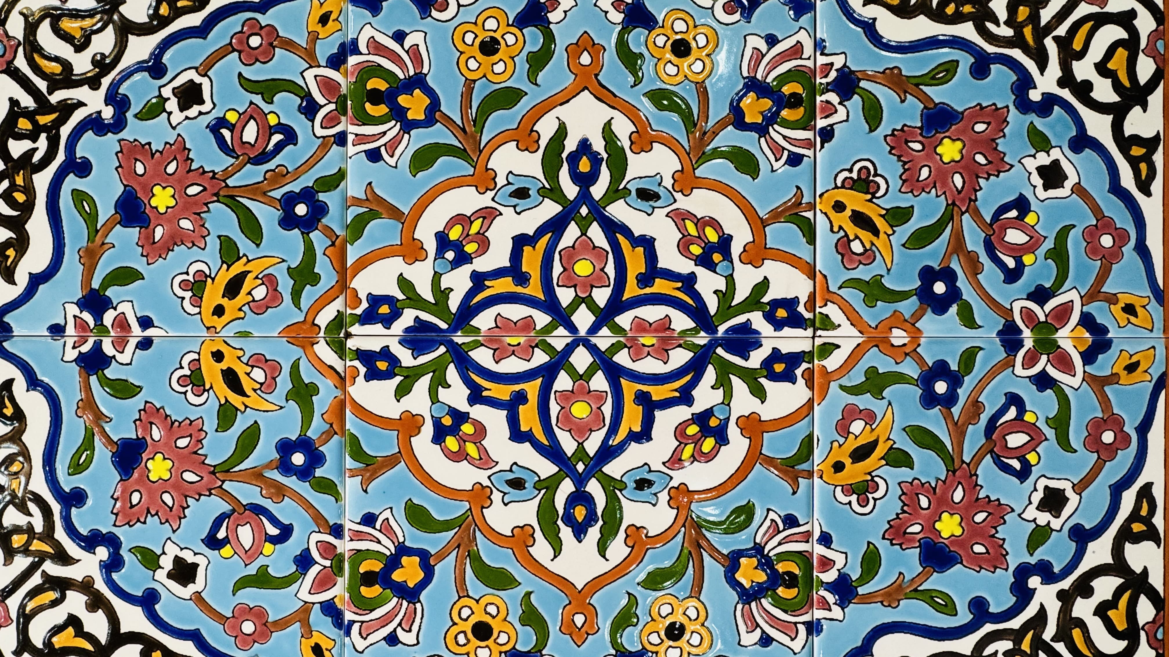 This handmade Islamic tile design features intricate floral and arabesque patterns in vibrant turquoise and navy, celebrating centuries of traditional craftsmanship and artistic heritage.